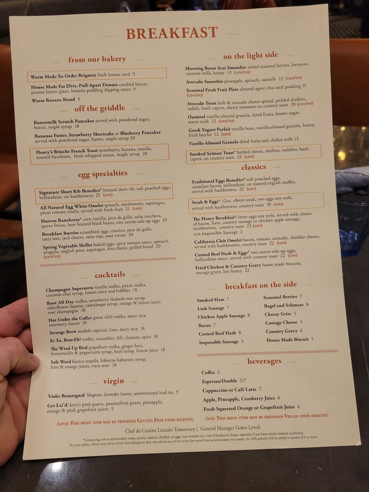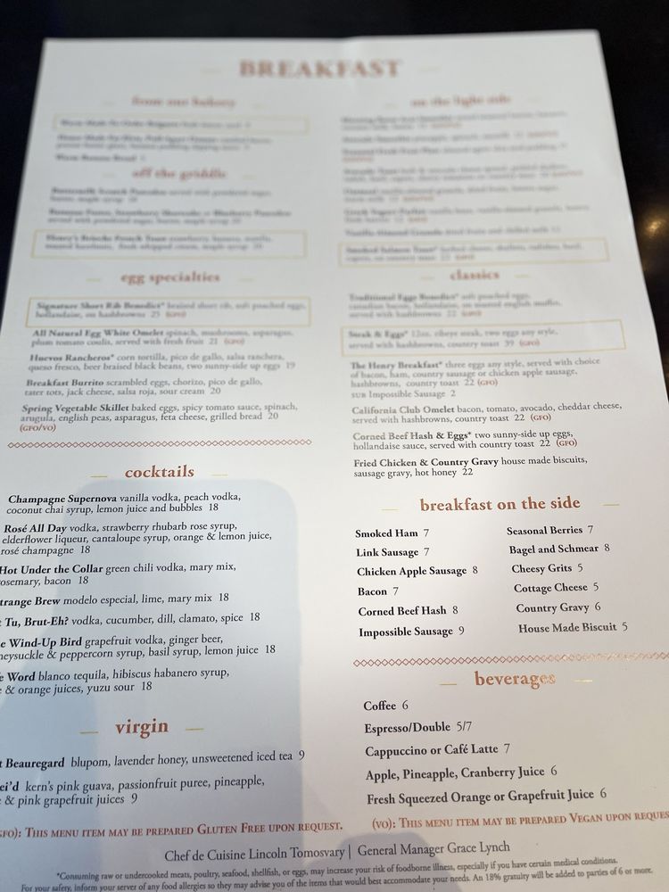 Introducing the menu at The Henry, a trendy American breakfast and brunch spot in Las Vegas. With unique hours from 10pm to 2pm, it caters to those seeking a meal during off-peak times. The menu offers a variety of options, including vegan and vegetarian choices, tater tot nachos topped with short rib, and a savory short rib benedict. Customer reviews rave about the attentive service and delicious offerings, from egg white omelettes to braised short rib benedicts. The Henry's ambiance and flavorful dishes, like the corned beef reuben and Henry burger, make it a must-visit for food enthusiasts looking for quality meals in a modern setting. Don't miss out on the delightful parfait or salmon toast for a satisfying dining experience at The Henry.